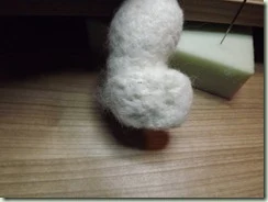 go in to the head right in the middle and tag the fibbers together, then around the tight felted part, and needle it good and secure onto the head. then work all the loose fluff onto the head.